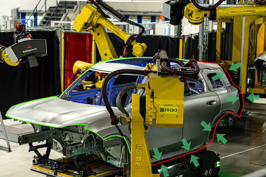 surfaceCONTROL Automotive 측정 시스템은 BIW 차체의 완전 자동화된 결함 검출에 사용됩니다. 해당 시스템은 난반사 표면에 프린지 라이트 투영 방식을 적용하고, 머신러닝 기반 알고리즘을 활용하여 압흔, 균열, 싱크 마크와 같은 국부 형상 결함을 아주 정확하게 검출하며, 높은 반복성을 제공합니다.